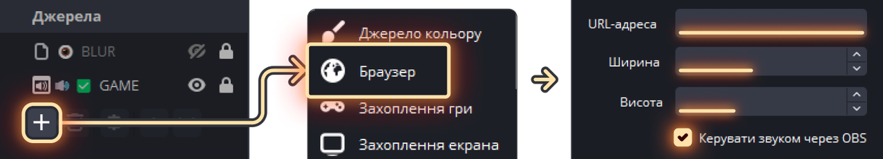 7. В OBS додай нове джерело 🌍 Браузер