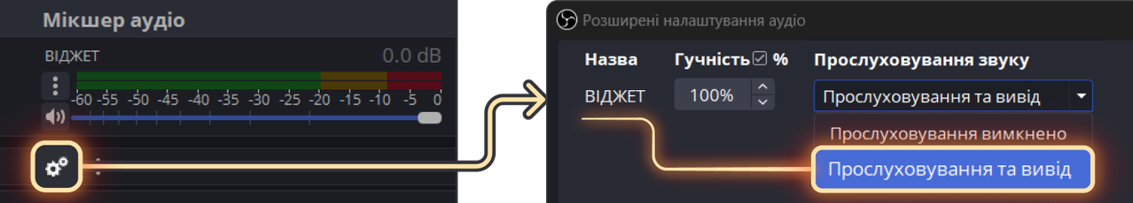 В розширених налаштуваннях аудіо ⚙️ вибери Прослуховування та вивід